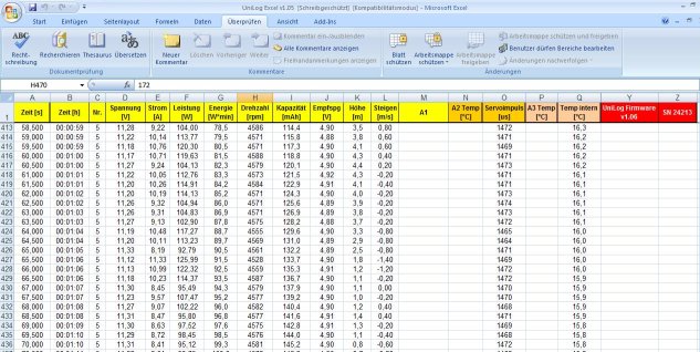 Alte Messungen werden im Speicher des UniLogs solange gespeichert, bis sie durch manuelles Löschen per Excel-Makro aus dem Speicher entfernt werden. Beim Einlesen der Messdaten werden stets alle Messdatensätze (auch die alten) in eine Excel-Tabelle eingelesen. ![]() Je nach Belieben kann man sich aus diesen Datentabellen auch nette Diagramme zaubern, die besser veranschaulichen, ob beispielsweise bei einer gewissen Steigrate die Drehzahl einbricht oder der in der Steigphase erforderliche Strom den Akku an seine Grenzen stoßen lässt. |