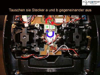 - Oft ist die Fernsteuerung auf Mode 1 eingestellt. Das bedeutet, dass die Motorleistung über den rechten Hebel geregelt wird. In Europa wird allerdings meist der Mode II verwendet. Besitzt man die ältere Version des Senders, ist die Umkonfiguration kein Problem. Zum Umbau ist die Fernsteuerung aufzuschrauben. Die Mechanik ist leicht selbst umzubauen. Bei der Elektronik hilft das folgende Schaubild. Hinweis: Hat man jedoch schon das neuere Sendermodell (WK 701), ist der Umbau nur mit sehr viel Aufwand zu bewerkstelligen. Dies wird hier nicht vorgestellt wird.
